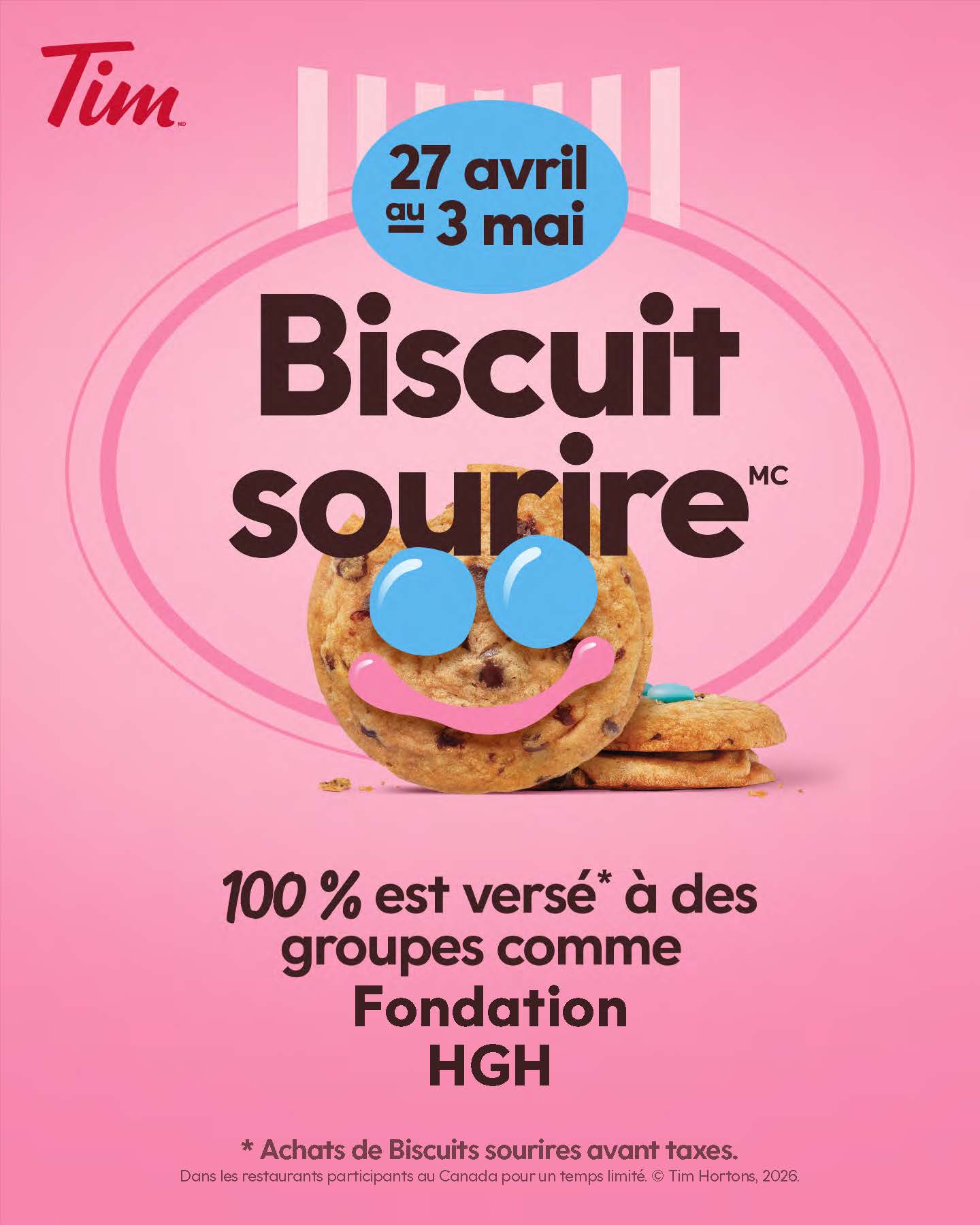 Du 27 avril au 3 mai, achetez un Biscuit sourire à un restaurant Tim Hortons® local et appuyez la Fondation HGH!